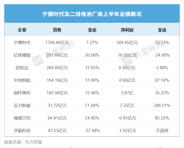 鋰電池企業(yè)期中考成績單公布,二線企業(yè)上半年整體業(yè)績同比改善,“寧王”繼續(xù)一大獨大。