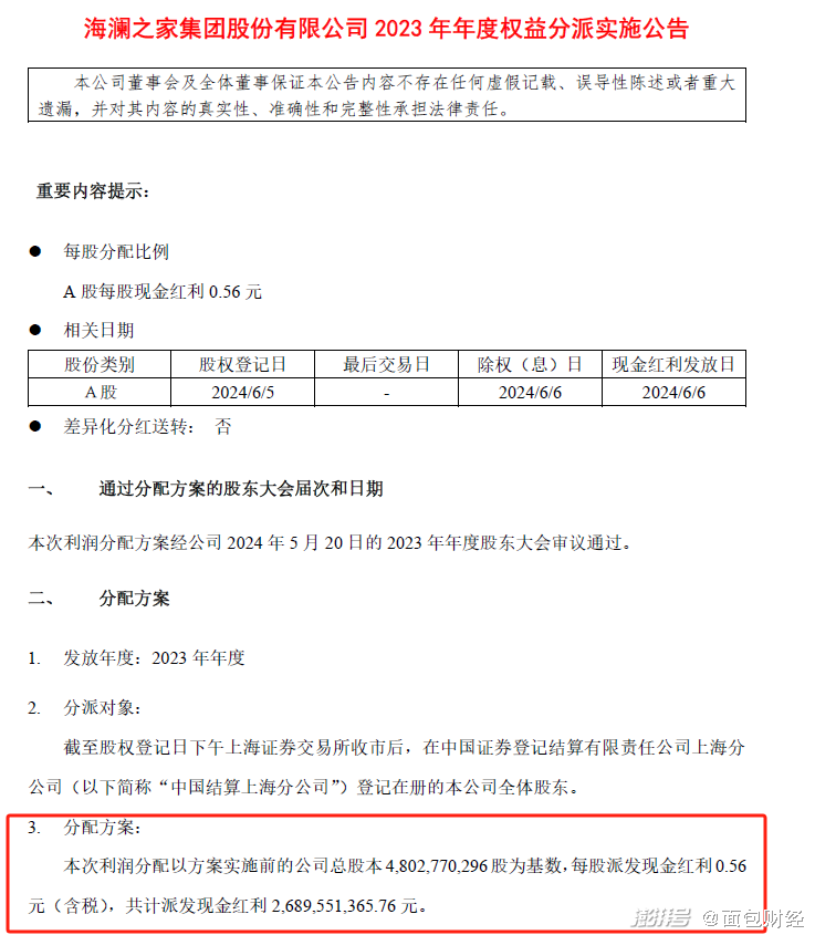 海瀾之家2023年年度權(quán)益分派實(shí)施公告顯示,公司2023 年年度分配方案為:以方案實(shí)施前的公司總股本4,802,770,296股為基數(shù),每股派發(fā)現(xiàn)金紅利0.56 元(含稅),共計(jì)派發(fā)現(xiàn)金紅利 2,689,551,365.76 元。