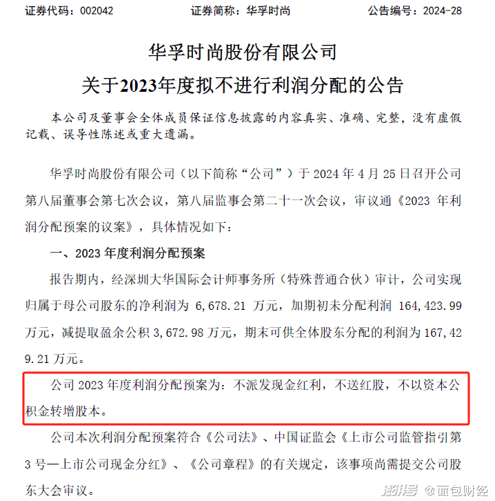 華孚時(shí)尚關(guān)于2023年度擬不進(jìn)行利潤分配的公告顯示,公司2023年度利潤分配預(yù)案為:不派發(fā)現(xiàn)金紅利,不送紅股,不以資本公積金轉(zhuǎn)增股本。